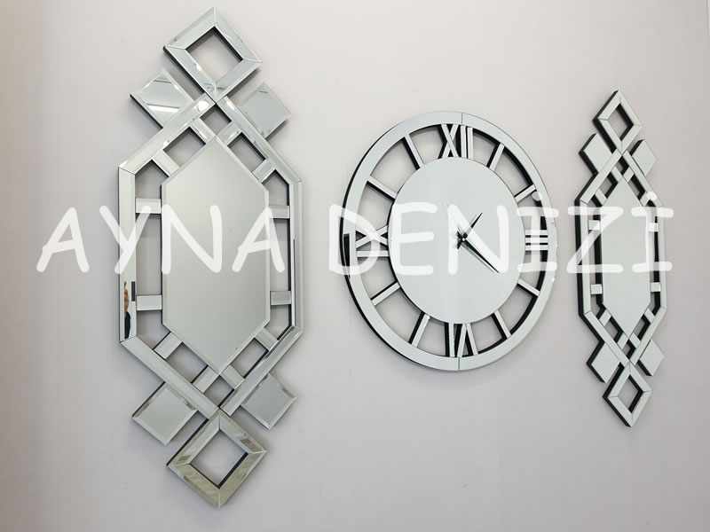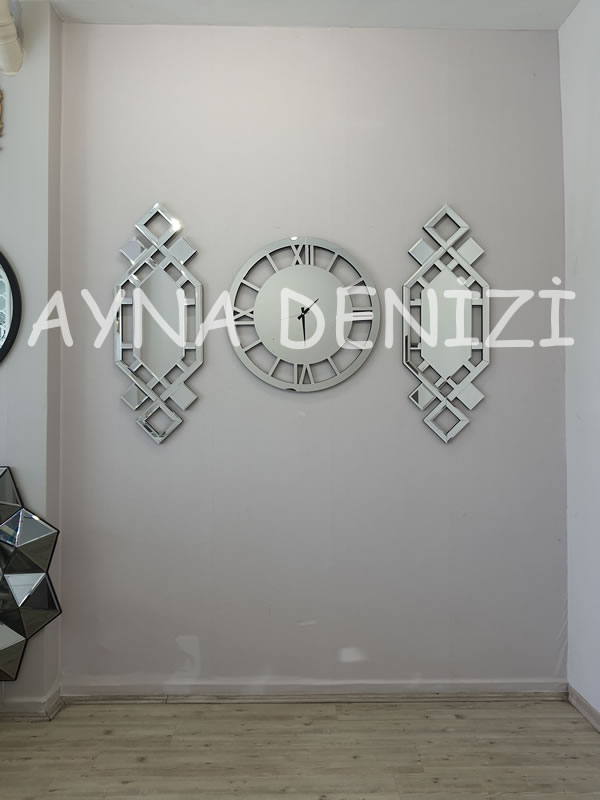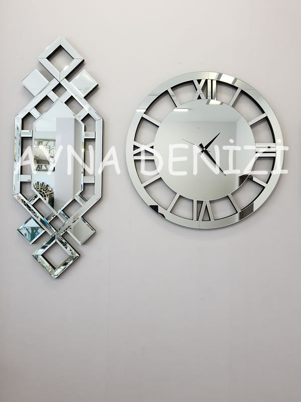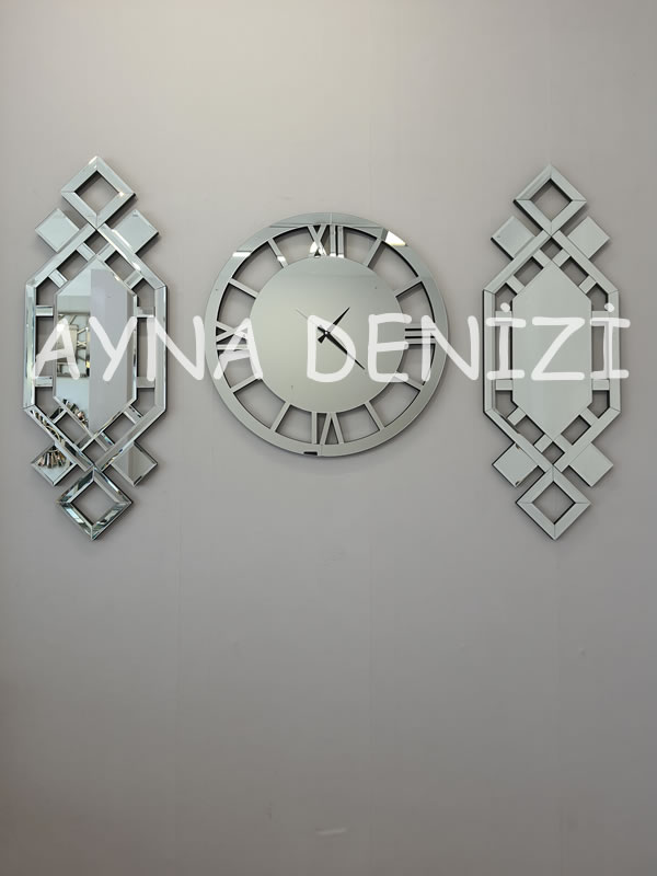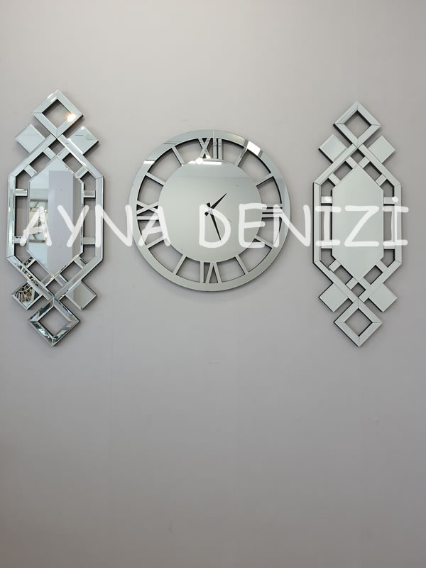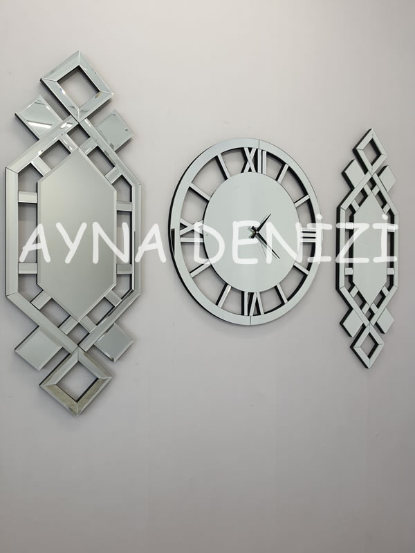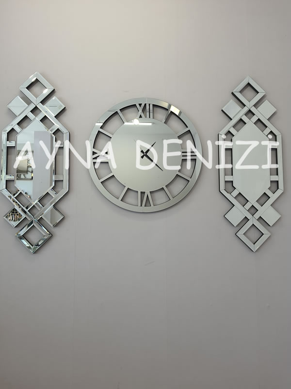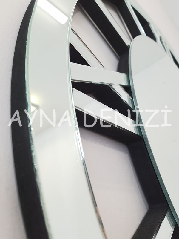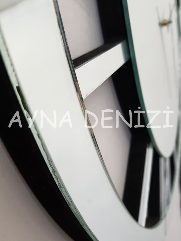 Aynı zamanda niş set takım içerisinde bulunan aynalı saat nedeniyle aynalı saatli niş takımı olarak da bilinmektedir. Belirli çapta cnc kesimi yapılmış mdf kasa üzerine, 4 mm flotal aynalı sayılarının ortaya çıkartılması sağlanarak, üzerine birebir çapları denk gelecek şekilde yapıştırılması ile üretilmiştir. Birçok aynalı saat modelleri için bizlere ulaşabilir, aynalı saat fiyatları için detaylı bilgi alabilirsiniz. Akrep ve yelkovanın tam bir uyum içerisinde durması sağlanmıştır. Saat mekanizması 1.sınıf olup, mekanizma dediğimiz kısım dünya standartlarında olup, herhangi bir sapma veya geri kalma durumu olmaz. Belirli kesim yöntemleri (normal, cnc) kullanılarak ortaya çıkarılan aynaların, kasa yapısı daha önceden oluşturulmuş, istenen renkte boyanmış çerçeveye, mdf ahşap üzerine montajlanması sonucu bu model ortaya çıkarılmıştır.