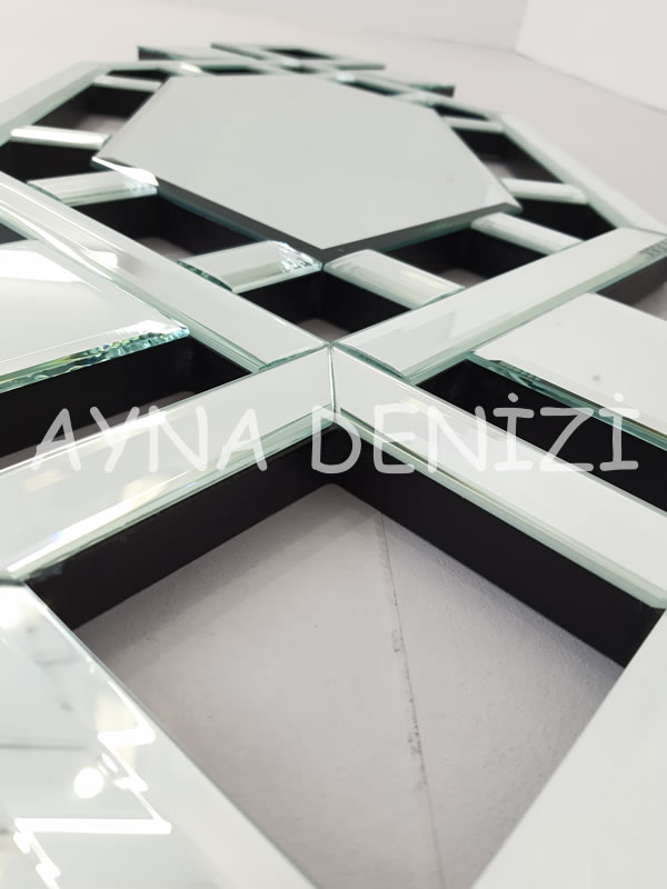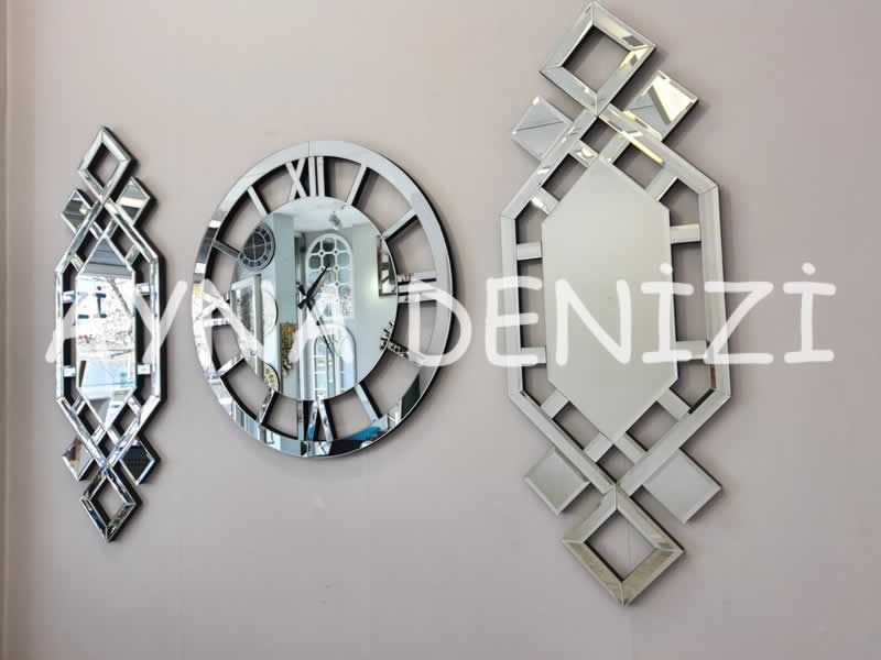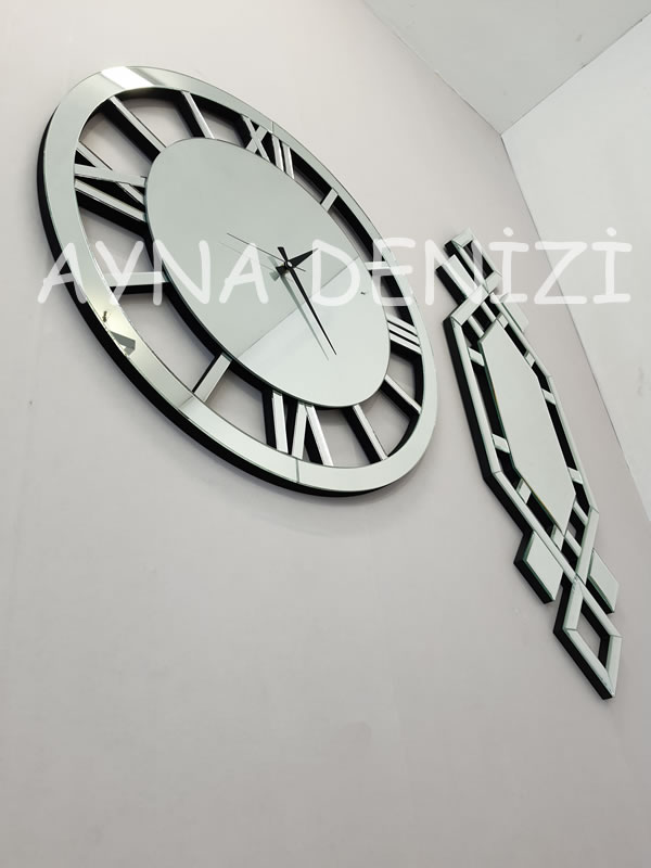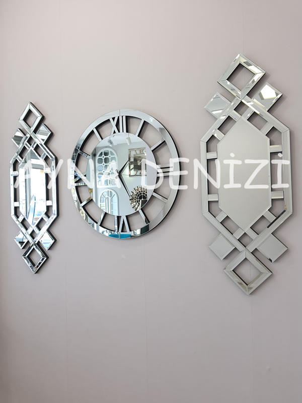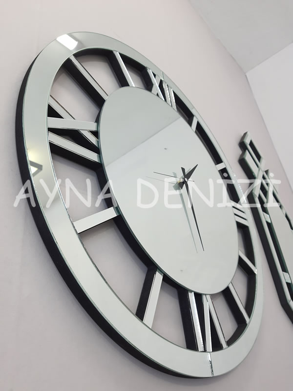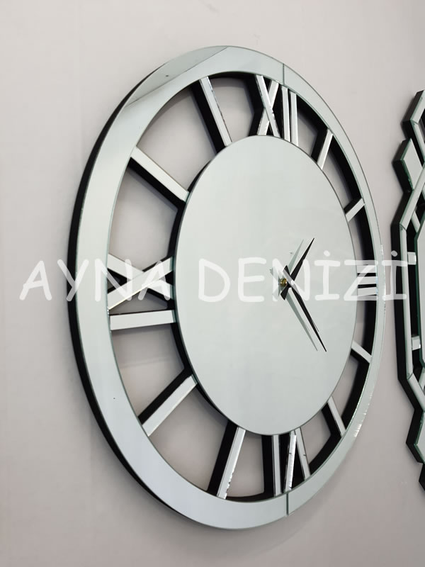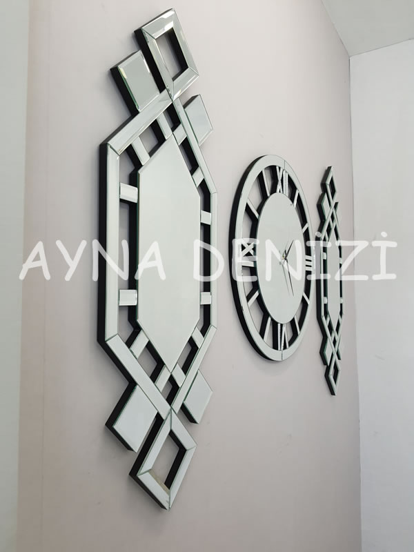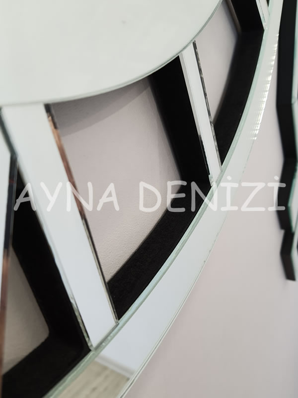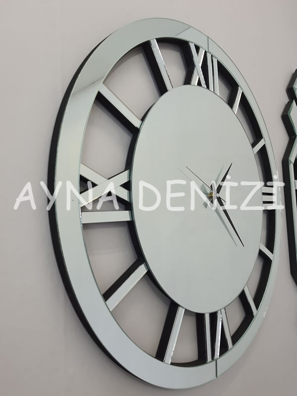 Aynı zamanda niş set takım içerisinde bulunan aynalı saat nedeniyle aynalı saatli niş takımı olarak da bilinmektedir. Belirli çapta cnc kesimi yapılmış mdf kasa üzerine, 4 mm flotal aynalı sayılarının ortaya çıkartılması sağlanarak, üzerine birebir çapları denk gelecek şekilde yapıştırılması ile üretilmiştir. Birçok aynalı saat modelleri için bizlere ulaşabilir, aynalı saat fiyatları için detaylı bilgi alabilirsiniz. Akrep ve yelkovanın tam bir uyum içerisinde durması sağlanmıştır. Saat mekanizması 1.sınıf olup, mekanizma dediğimiz kısım dünya standartlarında olup, herhangi bir sapma veya geri kalma durumu olmaz. Belirli kesim yöntemleri (normal, cnc) kullanılarak ortaya çıkarılan aynaların, kasa yapısı daha önceden oluşturulmuş, istenen renkte boyanmış çerçeveye, mdf ahşap üzerine montajlanması sonucu bu model ortaya çıkarılmıştır.
