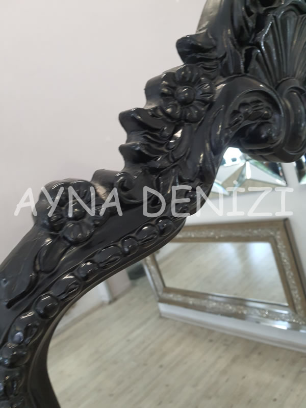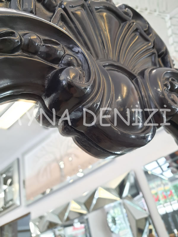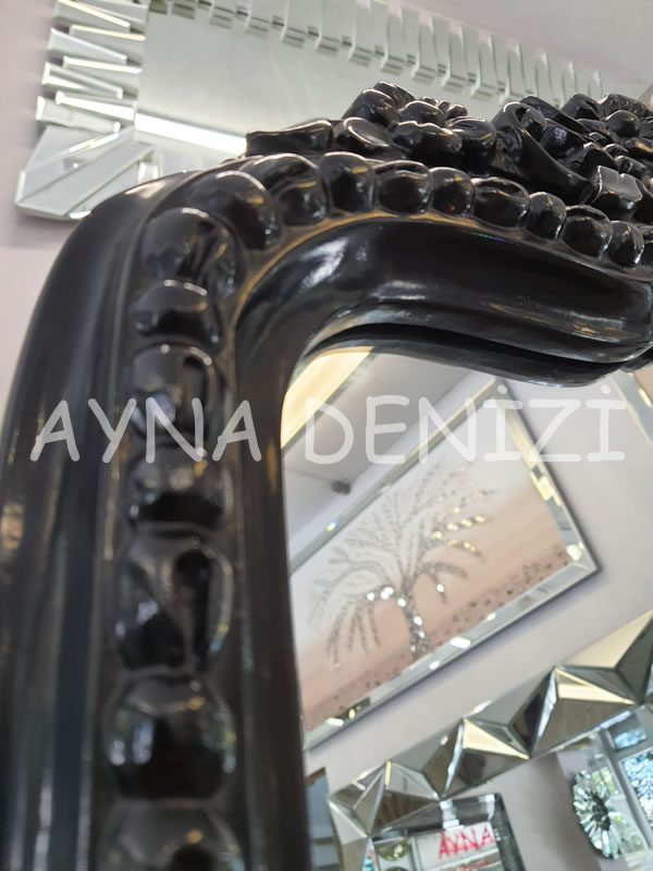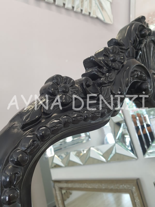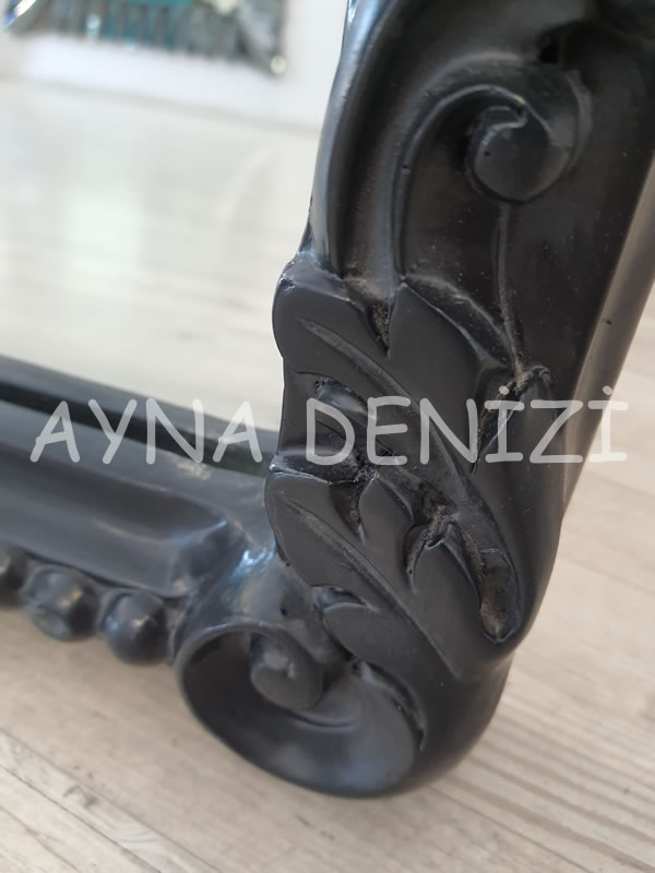 - Çerçeve Görünümü: Siyah Renk Oymalı (Düz Kesim Olmayan) Polyester (Plastik Değil) Çerçeve Üstü Şeffaf (Doğal) Renk Aynadır.