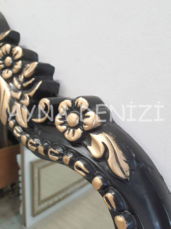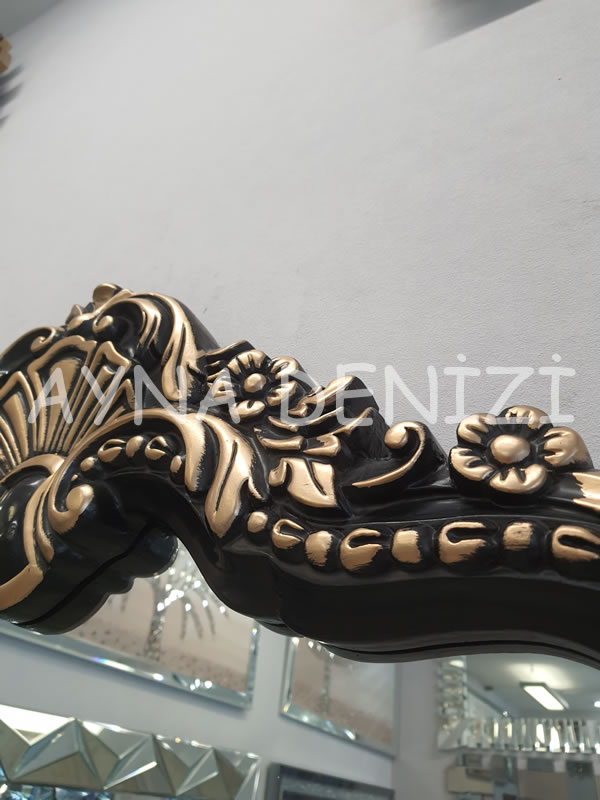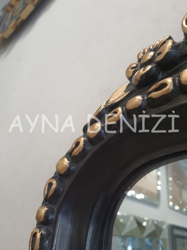 - Çerçeve Görünümü: Altın Renk İşlemeli Siyah Renk Oymalı (Düz Kesim Olmayan) Polyester (Plastik Değil) Çerçeve Üstü Şeffaf (Doğal) Renk Aynadır.