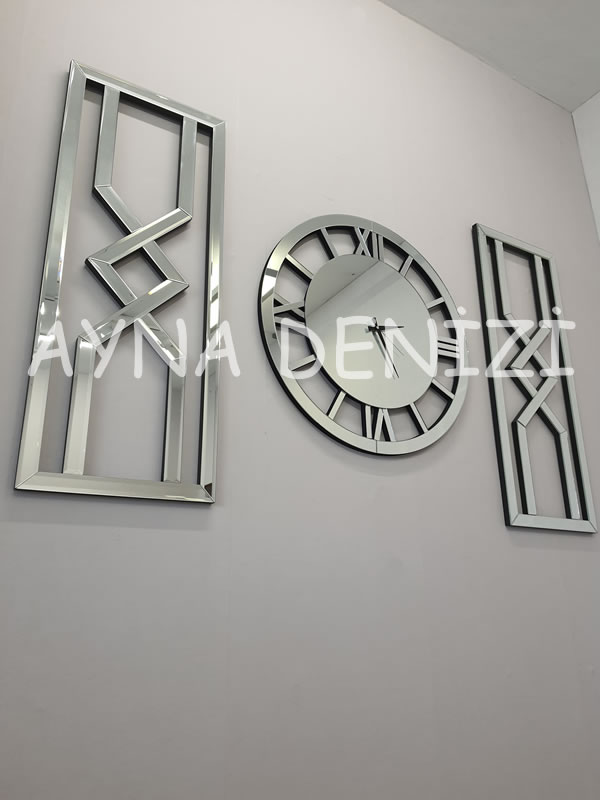 Aynı zamanda niş set takım içerisinde bulunan aynalı saat nedeniyle aynalı saatli niş takımı olarak da bilinmektedir. Belirli çapta cnc kesimi yapılmış mdf kasa üzerine, 4 mm flotal aynalı sayılarının ortaya çıkartılması sağlanarak, üzerine birebir çapları denk gelecek şekilde yapıştırılması ile üretilmiştir. Birçok aynalı saat modelleri için bizlere ulaşabilir, aynalı saat fiyatları için detaylı bilgi alabilirsiniz. Akrep ve yelkovanın tam bir uyum içerisinde durması sağlanmıştır. Saat mekanizması 1.sınıf olup, mekanizma dediğimiz kısım dünya standartlarında olup, herhangi bir sapma veya geri kalma durumu olmaz. Belirli kesim yöntemleri (normal, cnc) kullanılarak ortaya çıkarılan aynaların, kasa yapısı daha önceden oluşturulmuş, istenen renkte boyanmış çerçeveye, mdf ahşap üzerine montajlanması sonucu bu model ortaya çıkarılmıştır.